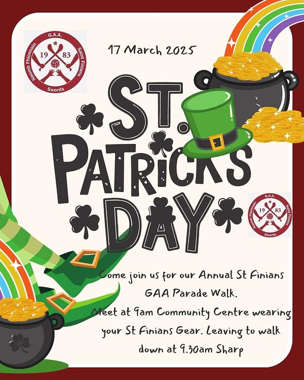 Let’s come together to celebrate our community and GAA Club! Mark your calendars! 🍀❤️ #StPatricksDay #StFiniansswords #CommunityCelebration